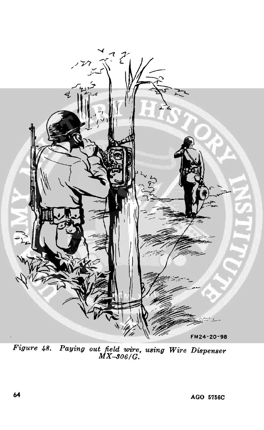 Paying out field telephone wire by hand using an MX-306/G wire dispenser.