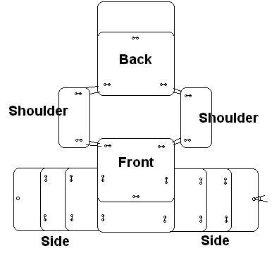 Construction ![]() Now you need to cut out twelve plastic plates, and drill sets of holes in each one. ![]() The height of front and back bottom plates and the side plates should equal your "front/back length" (B/A). Make the front and back plates as wide as you want them. The width of the side plates (three per side) is the difference in your girth and the front and back widths. That is, the side plates cover the space between the front and back plates, plus a one-to-two-inch overlap for each plate. The plates will overlap to support one another. ![]() The front top plate's width can be the same as the bottom plate, but you may wish to make it a little narrower so it doesn't interfere with bringing your arms forward. It's height is your front torso length minus the height of the bottom plate, plus a one-to-two-inch overlap again. Figure the size of the back top plate the same way, but using the back length measurement. The shoulder plates need to be long and wide enough to cover you shoulder naturally. On a big guy like me, ten by four inches works. Round off the plate corners; you don't want sharp points gouging you when you get hit. Now drill the sets of holes in each plate as indicated in the diagram. It's time to assemble your armor. ![]() Lay the plates out in a cross arrangement. Match up holes in one plate with the corresponding holes in an adjoining plate, and lace the plates together with a piece of cord. My preference for overlapping is to have the plate in front to be on top of the plate towards the rear. The shoulder pieces may be a problem. First, you might need to curve the plastic a little more. If so, gently heat them in your oven, or with a propane torch, until they soften slightly. Mold them, and let them cool. To get the right cord length to lace the shoulders on, you may need to put the armor on and cut the cord to fit.