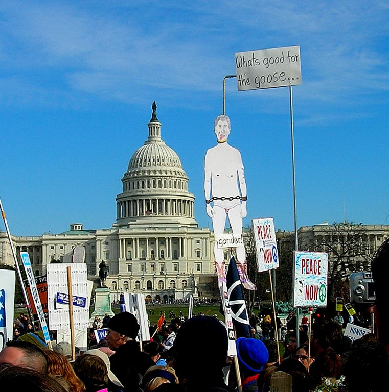 JIM BOVARD ATTENDED YESTERDAY'S BIG ANTI-WAR DEMONSTRATION and brought back the above politically incorrect statement. (Here's a link to the organization the woman is promoting.)