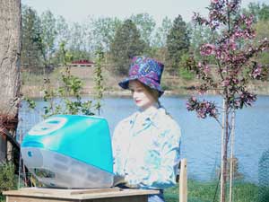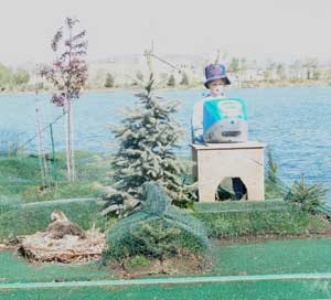 EfCom, the cool Apple computer dealer in Yakima, set Betty up with an old style appearing iMac stuffed with all the latest high tech linked to the center of the Galaxy and beyond. Might be a few inter-galactic games on there too, for when business gets boring. Well, with an island of her own, Betty is her own boss. Oh, there might also be a small bird nest in the computer, just in case a computer-savvy warbler shows up.
