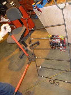 The featured project was that of turning the rectangular metal clothes drying rack found in the dumpsters, into a half circle Mountain Dragon Fire Pit swing-over grill frame. Actual construction, ah, er, destruction-phase work was completed. The rack was cut up with a bolt cutter. The bending and swearing part of the project was reserved for next project night, in keeping with productivity standards.