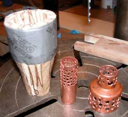 And the section of nicely spalded birch recovered from the wood shed at that very same shop several years ago was finally cut for an ideal project, the sub-kindler, as you can see. Well, the top belled copper fitting transferred too much heat from the modified torch striker cup that perfectly fit the chrome molly tube from Jon's scrap bin, held in place by the other copper fitting, so the less-conducting spalded birch replacement piece to attach the turkey baster oven bag was made, quite logically, as I am sure you would concur, especially after a snap of the Crown. A full report will be presented after and if the new piece is completed and works if it does.