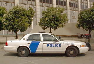 Taking names? A police cruiser from Department of Homeland Security kept watch at a recent anti-war demonstration outside Speaker Pelosi's office in San Francisco. (Courtesy AntiWar.com)