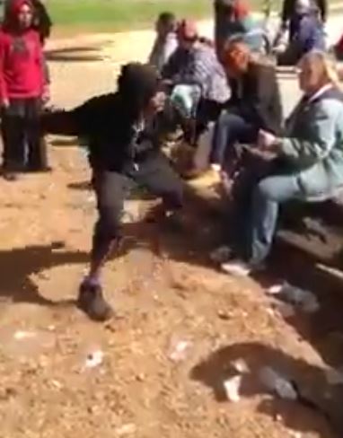 “She said you ain’t gonna smack her dog,” a female onlooker shouts from the sidelines.