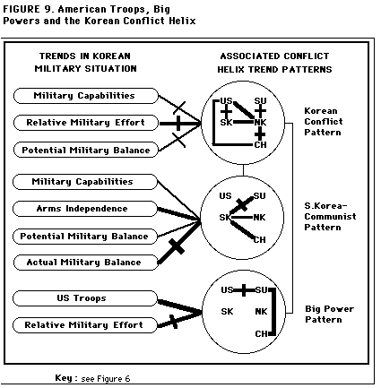 Of most importance is a Korean Conflict Pattern involving the United States-North Korea, South Korea-North Korea, Sino-Soviet, and Sino-South Korea helices, particularly the latter. The implication of this pattern is that the direction of conflict in Korea, aside from the effect of military factors (see Figure 9), is especially related to the ability of China and South Korea to form a structure of expectations. If such expectations breakdown and conflict escalates, the likelihood is that such will also occur with the United States and South Korea on the one hand, and North Korea on the other. Interestingly, there is a low, but notable inverse relationship of the Sino-Soviet helix to this movement. As the Sino-Soviet helix solidifies into cooperation there is some tendency for greater Korean conflict; and a tendency for less Korean conflict as Sino-Soviet conflict increases.