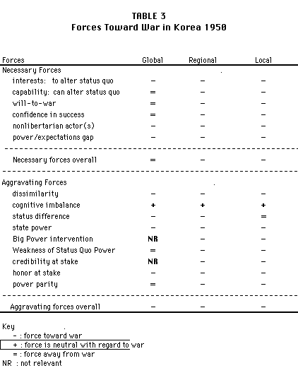 In Table 3 the necessary and aggravating forces are listed down the left of the table. The table's right-half shows the three situational levels for the period immediately predating North Korea's invasion. The direction of the forces of war is shown by arrows to illustrate their positive or negative effect. Each of the arrows is an historical judgment based on a knowledge of the period. Unfortunately, in the remaining pages I can only very generally suggest the basis for some of these judgments.