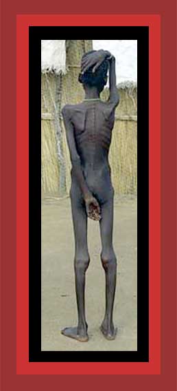 | The fundamentalist Arab, Muslim military government of Sudan has been waging a war against their black and non-Muslim south. Perhaps 2,000,000 have been killed in the war and resulting famine, much of which has been purposely caused by government destruction of food sources, including the bombing of wells and relief supplies. Here is shown what I believe is a starving boy in the South whose life expectancy, given his condition, must now be short For a description of this civil war, see Chapter 1 of Saving Lives, Enriching Life. Source: I remember this as coming from a news article on Sudan, but I could not find again the source. |