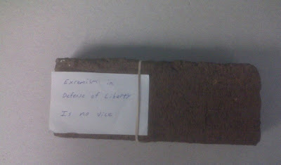 The weapon: A brick, to which a piece of paper bearing the message "Extremism is defense of liberty is no vice" was attached with a rubber band.
