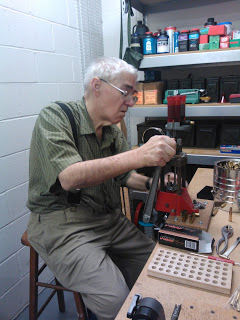 Reloading .38s on a friend's turret press. You can see I've lost considerable weight since last year -- about 130 pounds all told -- and my clothes are rather too large for me. Still, I cranked off about 400 125 Grain JHPs for the stash. And at the moment, I don't even have a .38. Had to sell it last week. But my theory has always been Guns are easy. Logistics is hard.