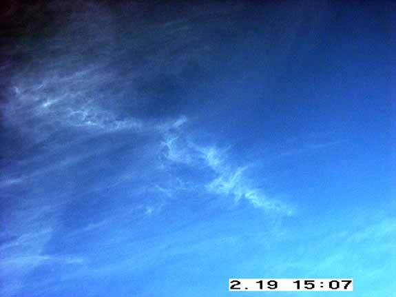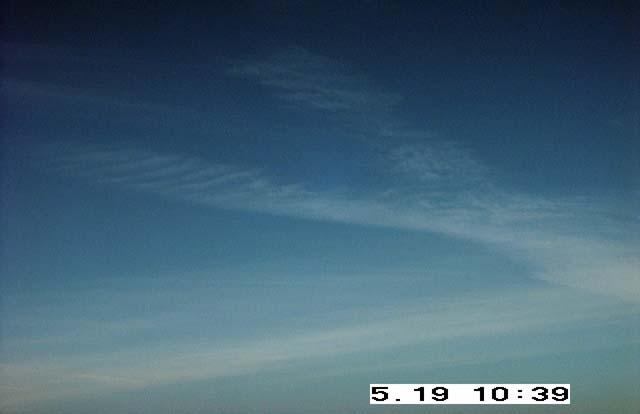 | Cloud Anomalies Note that the edges of the weather control patterns in the clouds are now deliberately "roughed up" to make them appear more "normal". Note also that most of these patterns were relatively stable in wind-blown skies, and were not fleeting aberrations. When the power was cut, they would dissipate almost immediately. Also, there may well be several different man-made phenomena going on with the creation of these "clouds" and "chemtrails", possibly involving different covert groups, different nations, and different programs and agendas, so one single simple interpretation is probably not appropriate. Candidates for the foregoing would probably also include the alleged Global Sunscreen Program and HAARP. A final caveat - some of these patterns may indeed by natural phenomena. All photographed in the Santa Barbara, California area by Tony Craddock unless otherwise noted. Some photos enhanced slightly for contrast. |